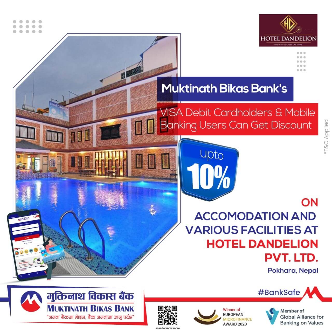 मुक्तिनाथ विकास बैंकले आफ्ना भिषा डेविट कार्डवाहक तथा मोबाइल बैंकिङ्ग ग्राहकहरुलाई थप सेवा दिन विभिन्न व्यवसायिक संस्थाहरुसँग सम्झौता गर्दै आएको छ । यसैक्रममा बैंकले पोखरामा रहेको होटेल ड्र्यानडलियनसँग व्यवसायिक सम्झौतामा हस्ताक्षर गरेको हो ।